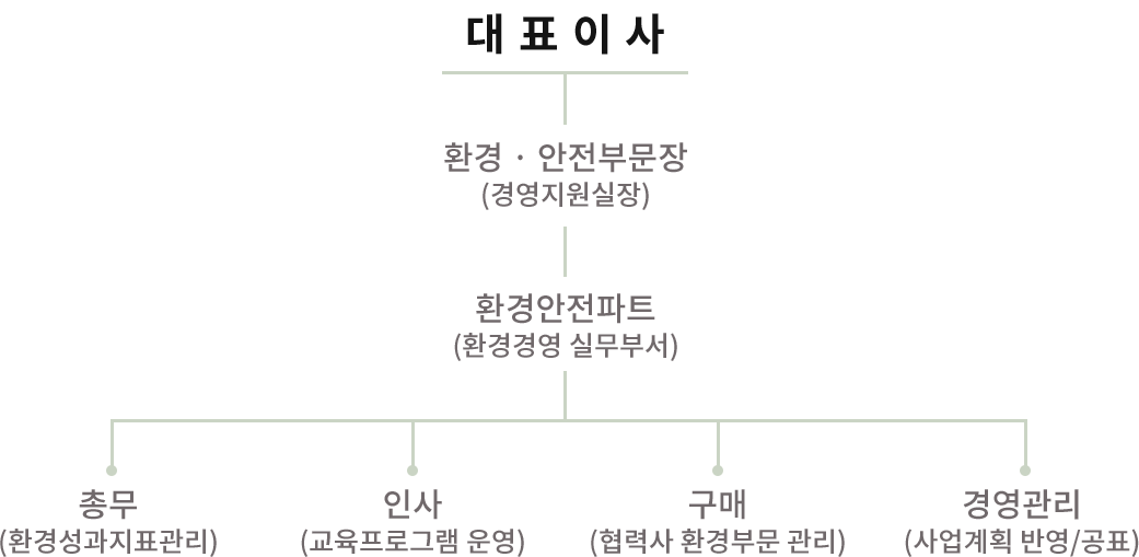 환경안전파트를 중심으로 각 사업부가 참여한 친환경 경영 협의체를 구축하고, 친환경 부문 현안과 이슈사항을 발굴·파악하여